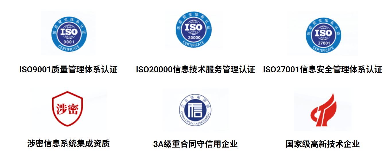 自创立以来,公司始终秉持“技术立企、服务兴业”的初心,十年间稳健前行、快速发展,已成为区域领先的ICT综合服务商。凭借卓越的交付能力与持续的创新投入,我们陆续通过ISO9001、ISO20000、ISO27001等国内权威体系认证,并取得“国家级高新技术企业”“科技小巨人领军企业”等多项政府资质,同时拥有涉密信息系统集成资质及“双软”“3A信用”等荣誉。厚重的历史沉淀与亮眼的资质榜单,共同见证了公司从初创到领跑的每一步,也为未来更高质量的发展奠定了坚实基础。